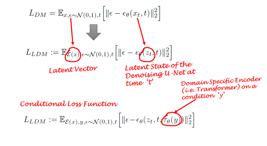 扩散模型通过逐步去除正态分布变量中的噪声来学习数据分布。换句话说,DMs采用长度为T的反向马尔可夫链。这也意味着DMs可以建模为时间步长T =1,…,T的一系列T去噪自编码器。这由下式中的εθ表示。请注意,损失函数依赖于隐向量而不是像素空间。