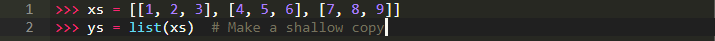 在上面的例子中,我们(似乎)只对xs做了一些改变。但事实证明,xs和ys索引为1的子列表都进行了修改。发生这种情况是因为我们只创建了原始列表的浅拷贝。