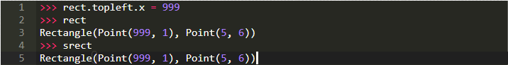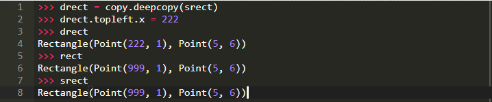 如果你检查原始矩形及其副本,你会看到__repr__()重写进行良好,并且浅拷贝过程按预期工作: