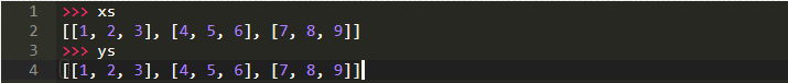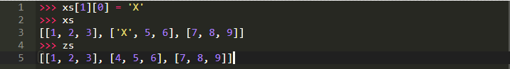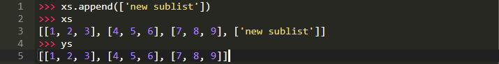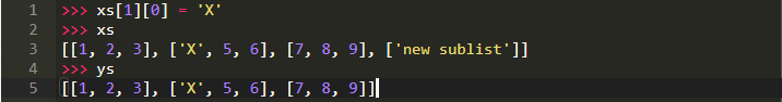 因此,当你修改xs中一个子对象时,此修改也会在ys中反映出来——这是因为两个列表共享相同的子对象。这种拷贝只是一个浅层,一层的拷贝: