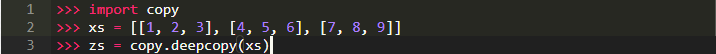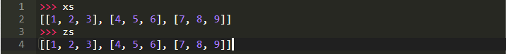 当你检查xs和我们用copy.deepcopy()创建的副本zs时,你会发现它们看起来都一样——就像前面的例子一样:
