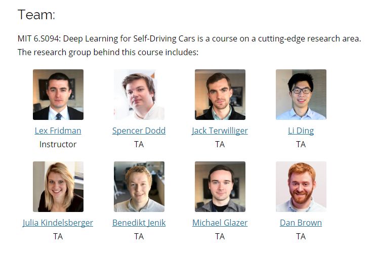 领衔授课人是Lex Fridman,麻省理工学院研究员,致力于研究以人为中心的人工智能,主要研究深度学习在半自动驾驶环境下的应用,比如感知驾驶员状态、感知场景、运动控制和规划等等。