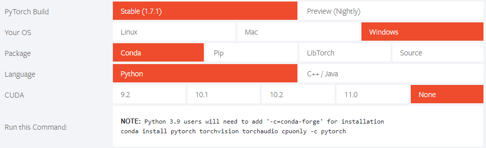 需要注意的是,如果在Windows下安装,需要先安装 torch 和 torchvision(安装方法详见官方网址 https://pytorch.org)。在 pytorch 网站上,一定要选择正确的CUDA版本。如果只想在CPU模式下运行,请选择 CUDA = None。