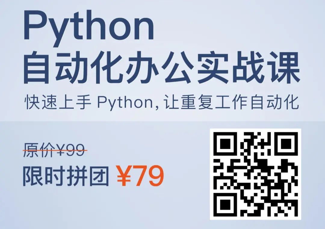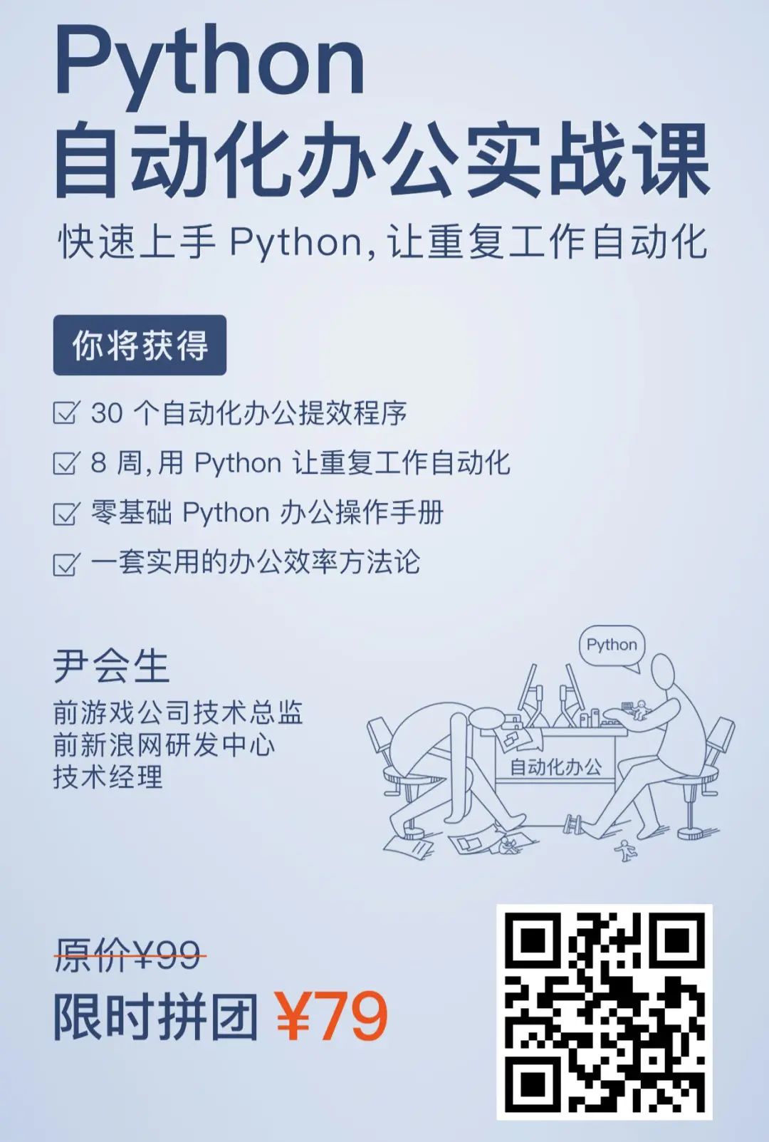 所以,我再次和极客时间合作,打磨出了《Python 自动化办公实战课》专栏。在课程中,我会为你准备 30 个拿来即用的自动化办公提效程序,和一套实用的 Python 办公效率手册,8 周的时间,让你告别重复工作,提升自己的工作效率。