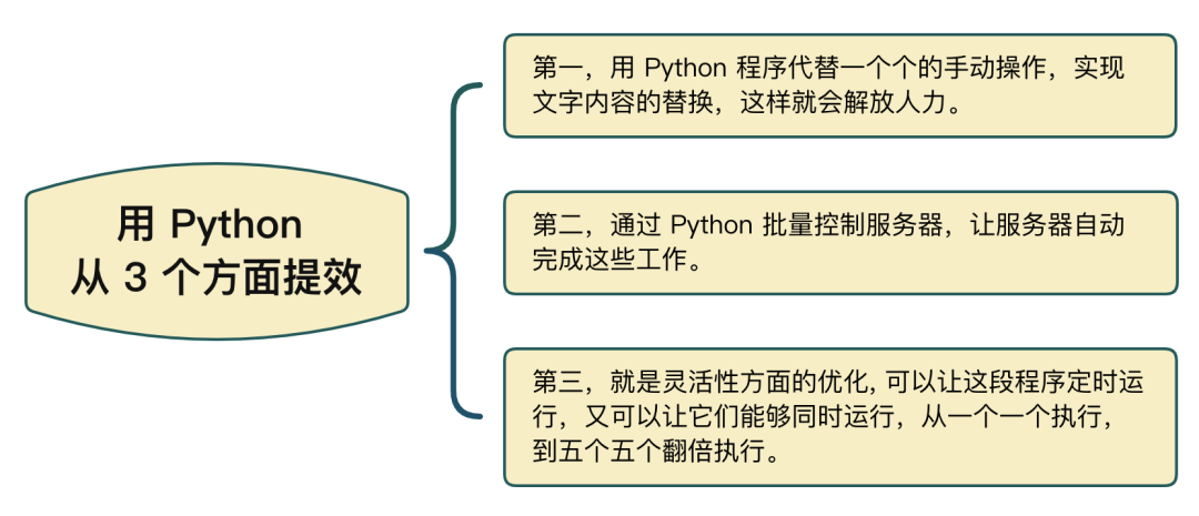 很低效对不对?换个思路,如果用 Python 的话,就可以从 3 个方面来提升效率: