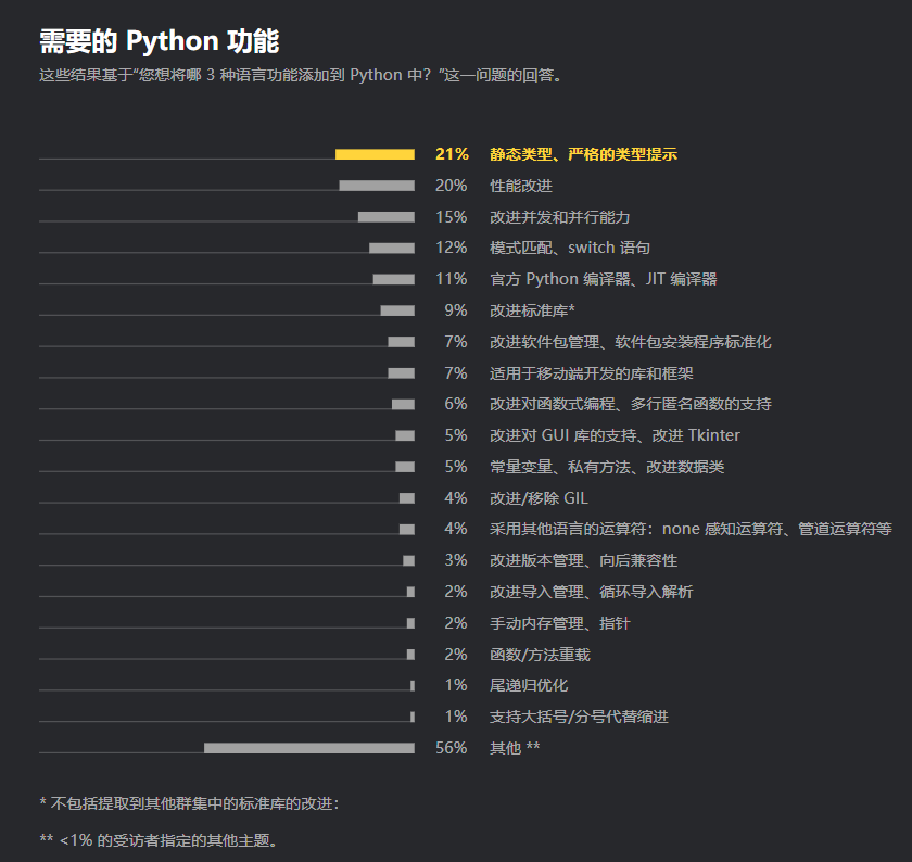 未来,在 Python 开发者最希望该语言增加的特性中,静态类型和严格的类型提示是最被希望添加的特性,占 21% 的受访者;紧随其后的是性能改进,占 20%。排在第三位的是更好的并发性和并行性,占 15%。