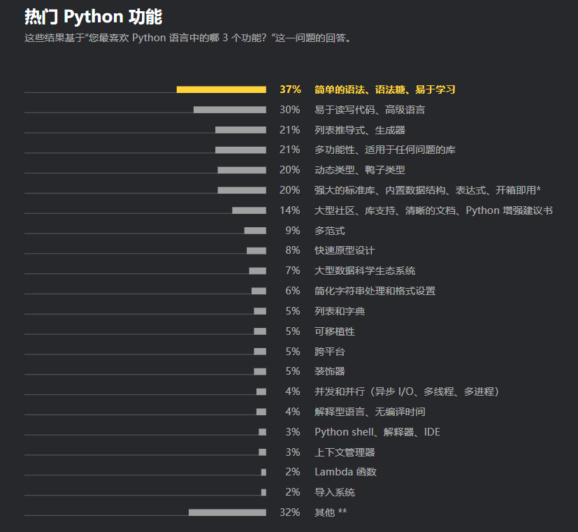 调查结果显示,Python 开发人员将简单和易用性作为使用该语言的主要原因,不过他们仍然希望获得静态类型和性能改进等功能。具体表现为,Python 的简单语法、语法糖和易学性以 37% 的占比成为受访者最喜欢的特性;易于读写代码和高级语言(30%)则是受访者第二喜欢的特性。