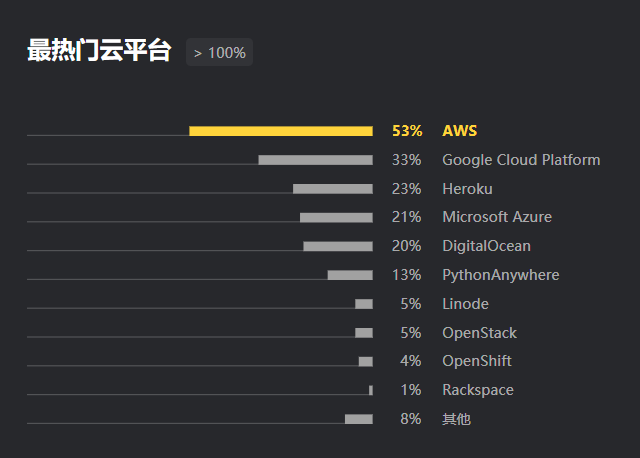 PostgreSQL 是 Python 开发者中最受欢迎的数据库,在 AWS 用户中更加普及,占比高达 65%。