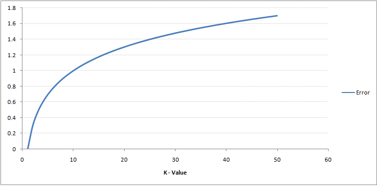 仔细观察,我们会发现随着 K 值的增加,边界变得更平滑。当K值趋于无穷大时,分类区域最终会全部变成蓝色或红色,这取决于占主导地位的是蓝点还是红点。我们需要基于不同K值获取训练错误率和验证错误率这两个参数。以下为训练错误率随K值变化的曲线: