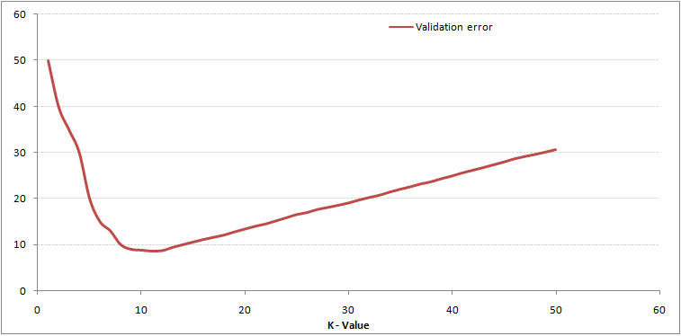 显然,在 K=1 的时候,我们过度拟合了边界。因此,错误率最初是下降的,达到最小值后又随着 K 的增加而增加。为了得到K的最优值,我们将初始数据集分割为训练集和验证集,然后通过绘制验证错误曲线得到K的最优值,应用于所有预测。