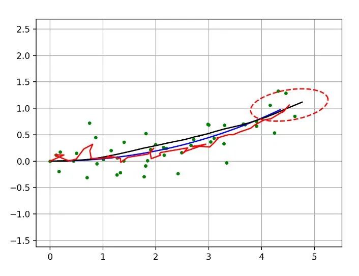 蓝线为真实路径,黑线为导航推测路径(dead reckoning trajectory),绿点为位置观测(如GPS),红线为EKF估算的路径。