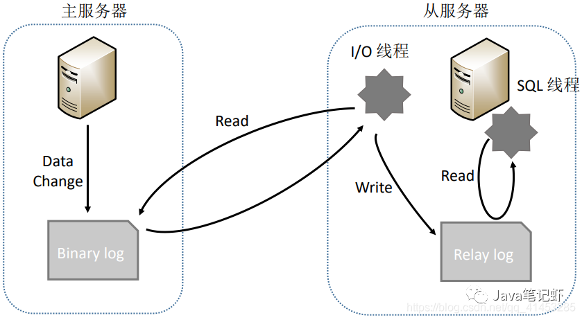 - 从服务器调用I/O线程读取主服务器的Bin log,并且写入到自己的Relay log中,再调用SQL线程从Relay log中解析数据,从而同步到自己的数据库中