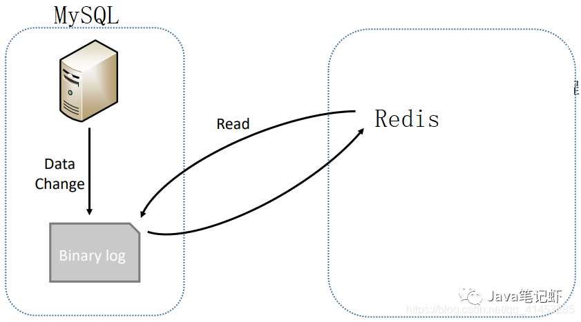 - 我们方案2也是如此,就是在概念上把主服务器改为MySQL,把从服务器改为Redis而已(如下图所示),当MySQL中有数据写入时,我们就解析MySQL的Bin log,然后将解析出来的数据写入到Redis中,从而达到同步的效果