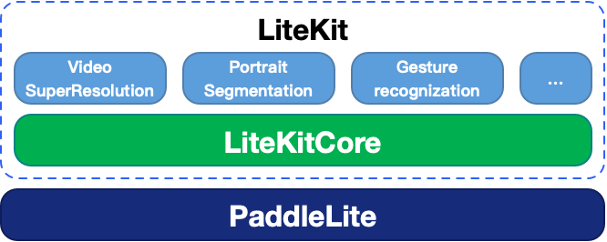 2. 中间的 LiteKitCore 框架层:隔离了业务方对 Paddle Lite 的直接依赖,并向上层提供基本一致的 OC、Java、C++ API,提供了基础结构和数据类型的定义,并提供通用的工具集。3. LiteKit 业务层:根据各自不同的业务,封装了人像分割、视频超分、手势识别等能力。LiteKit 的能力将会不断的扩充。