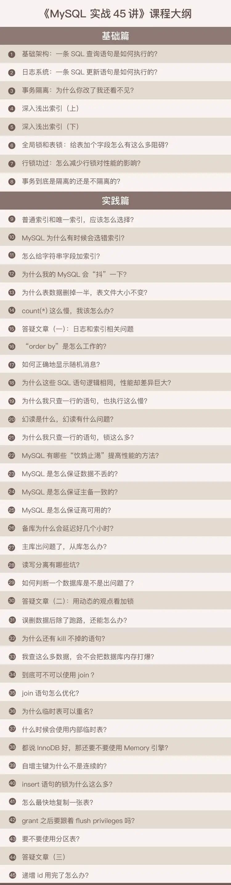 一共 45 讲,全部更新完毕,信息量超大,结合了丁奇自己的理解和实战心法,还深入探讨了 36 个 MySQL 常见痛点问题,再配合手绘的 100+ 详解图,真正梳理出一条完整系统的 MySQL 学习路径。看完后,你也一定可以少走“弯路”,洞悉本质。