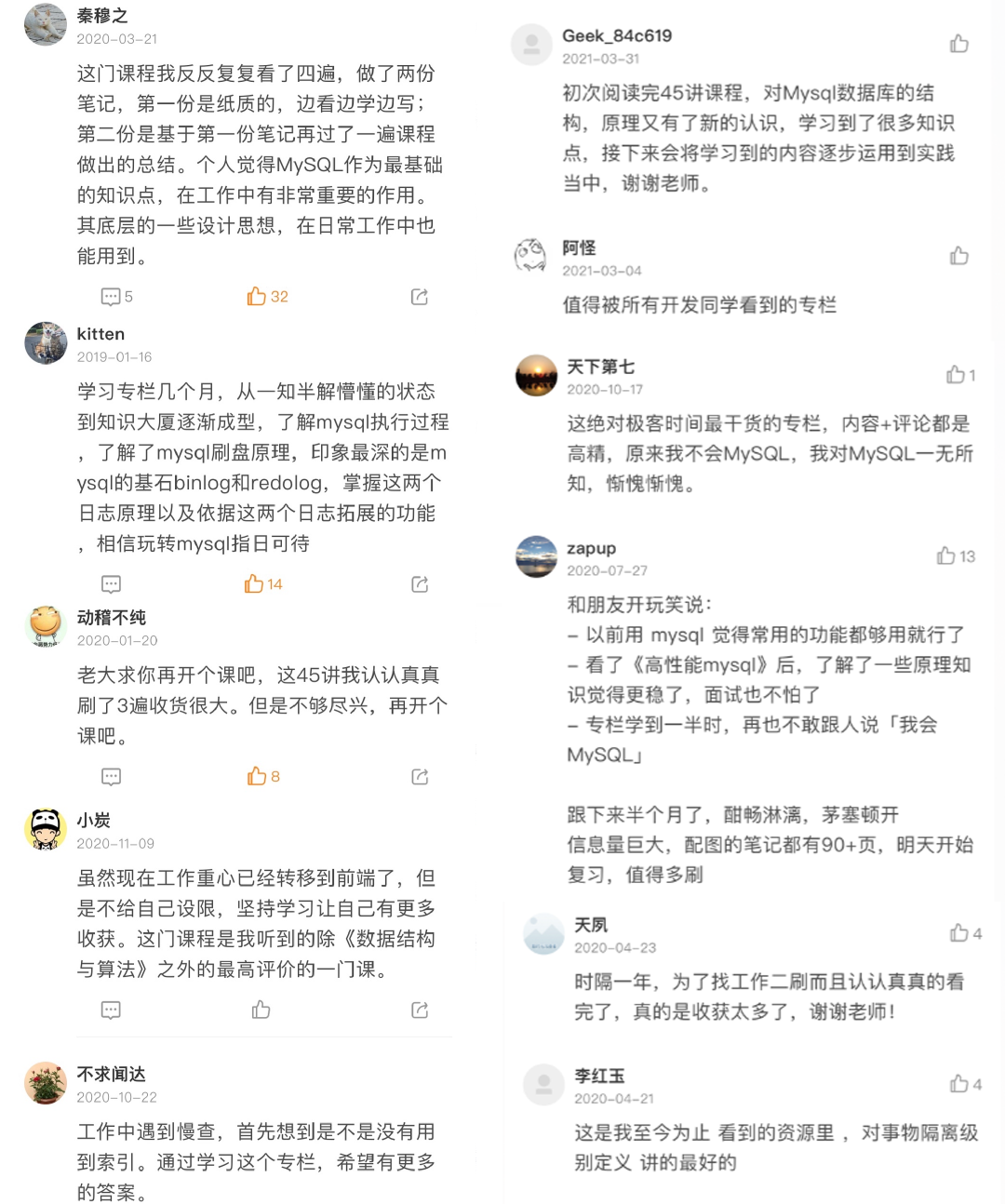 只要能认真跟着学,一定能搞懂 MySQL 中那些经典、巧妙的设计,并且把这些设计思路应用到自己的工作中,可以说是长期的影响到了我。