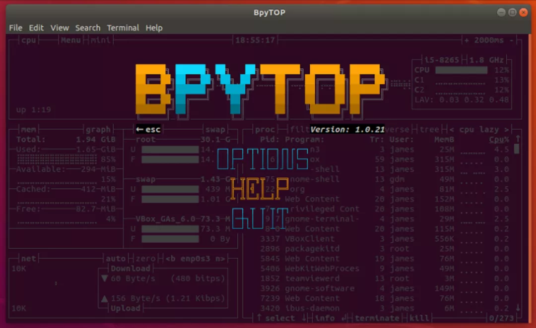 安装完毕之后,Bpytop 显示系统的资源使用情况如下: