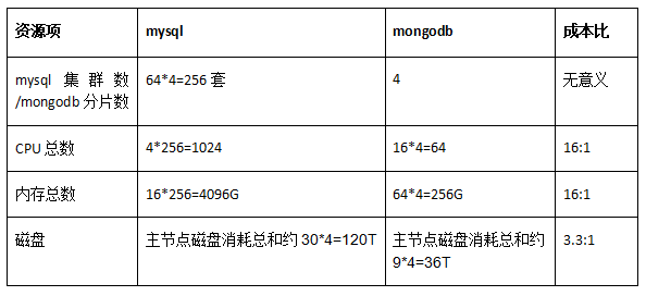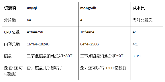说明:由于MySQL迁移MongoDB后,数据不在往MySQL中写入,流量切到MongoDB时候MySQL中大约存储有400亿数据,因此我们以这个时间点做为对比时间点。以400亿数据为基准,资源消耗对比如下表(每个分片只计算主节点资源消耗,因为MySQL和MongoDB都是4副本):