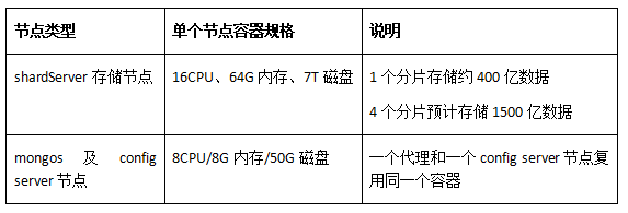 此外,由于分片集群还有mongos代理和config server复制集,因此还需要评估mongos代理和config server节点规格。由于config server只主要存储路由相关元数据,因此对磁盘、CUP、MEM消耗都很低;mongos代理只做路由转发只消耗CPU,因此对内存和磁盘消耗都不高。最终,为了最大化节省成本,我们决定让一个代理和一个config server复用同一个容器,容器规格如下: