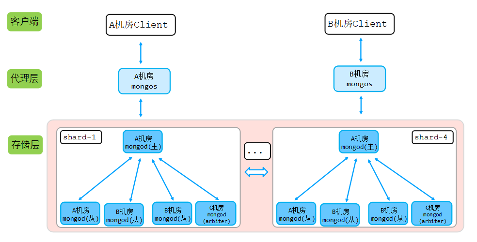 每个机房代理部署2个mongos代理,保证业务访问代理高可用,任一代理挂掉,对应机房业务不受影响;