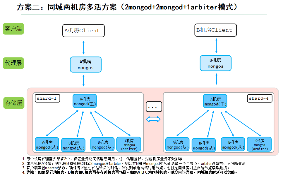 如果机房A挂掉,则机房B和机房C剩余2mongod+1arbiter,则会在B机房mongod中从新选举一个主节点。arbiter选举节点不消耗资源;