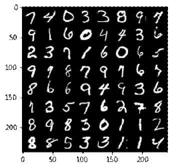 从结果上非常不错了,训练的准确率已经逼近了99%,而且还有上升的趋势,如果继续进行训练还能有更好的表现,不过也有可能会有过拟合的风险。下面我们使用测试集来验证模型对手写数字识别的效果如何。 随机抽取64张测试集的图片,它们的真实标签和图片显示如下: