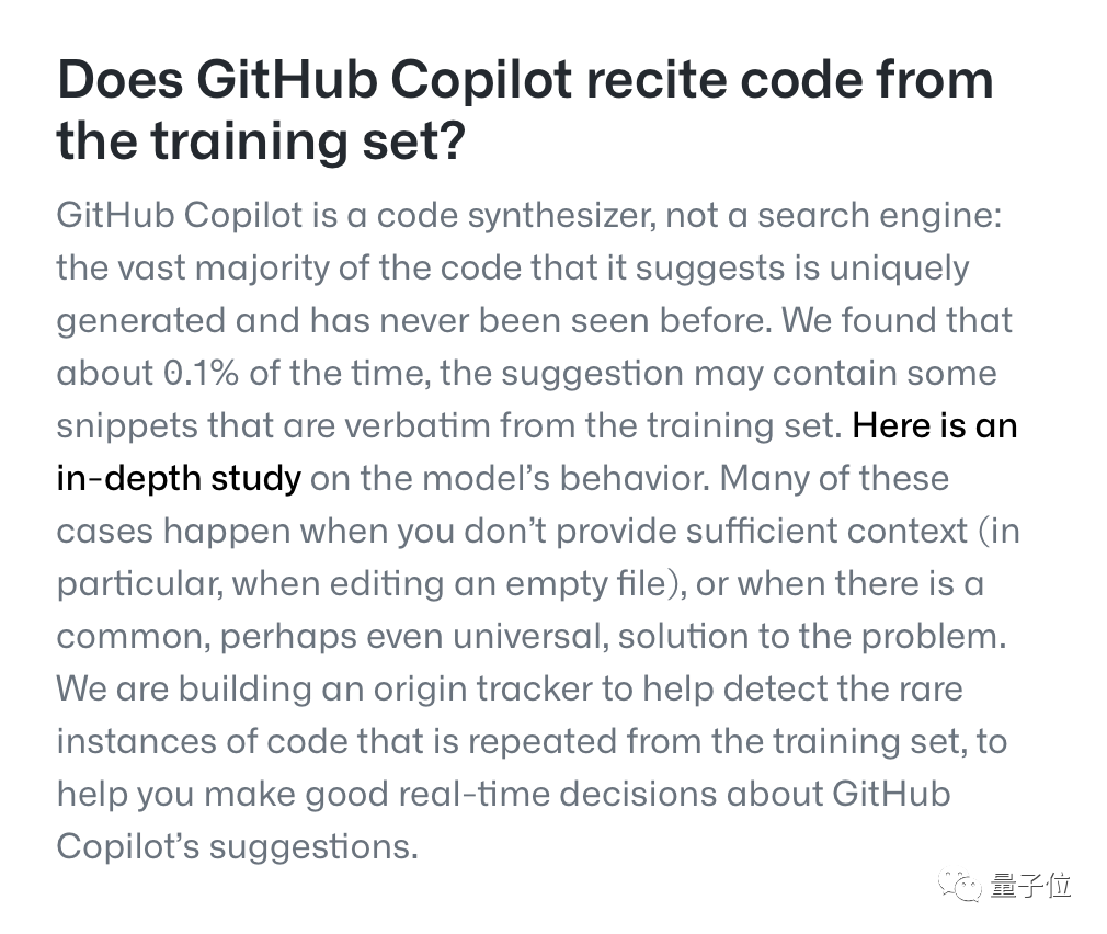 在0.1%的情况下,GitHub Copilot建议可能包含一些来自训练集的逐字片段。