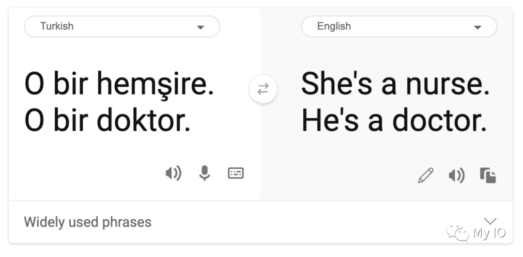 机器翻译中存在着刻板的性别观。在将“他是护士,她是医生”翻译成土耳其语时,遇到了一些问题。土耳其语是一种无性别的语言,它有一个代词“o”来表示单数第三人称,但把这个句子从土耳其语翻译成英语,会产生“她是护士,他是医生”这样的刻板印象和错误。