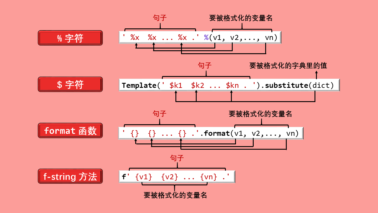 如果光看例子,那真是千奇百怪,但透过例子看本质,每种方法都有通用的语法格式,如下图总结。