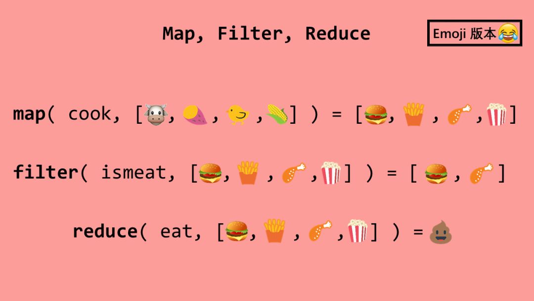 将 eat 函数压缩(reduce)牛、土豆、鸡和玉米成排泄物,因此 reduce 函数是用第一个参数(函数)作用到它第二个参数(容器型数据)上,得到一个元素型数据。