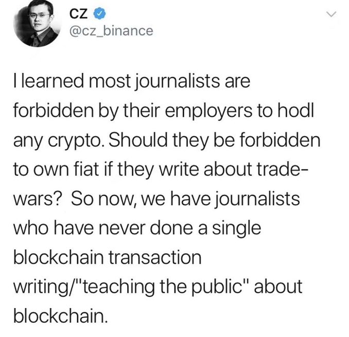 CZ赵长鹏的性格中的一部分来自他对加密货币和区块链的信仰。他曾在社交媒体上公开表示,从事区块链行业的媒体人士也需要尝试去持有(HODL)一些加密货币,只有持有一些加密货币才可能教会公众,什么是区块链。
