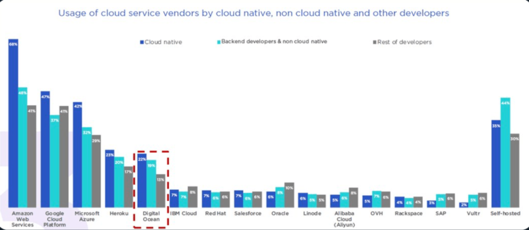 与三大巨头相比,DigitalOcean 排名第五,排除 3 巨头后排名第二。DigitalOcean 对简单性、出色的客户支持和透明定价的关注在开发人员忠诚度方面得到了回报。