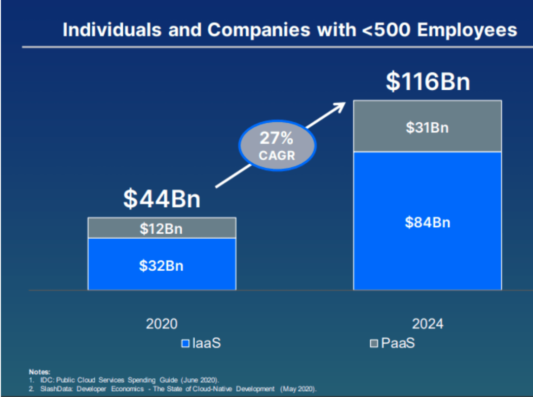 让我们来看看 DigitalOcean 的市场示意图。DigitalOcean 在一个可寻址的 SMB 市场中运营,因此虽然一些投资者可能热衷于从整体上看待全球 IaaS/PaaS 市场,但我们应该专门针对 SMB(员工少于 500 人的企业)倾斜 DigitalOcean 的 TAM。这将范围缩小了一点,但我们仍在关注一个巨大的市场。