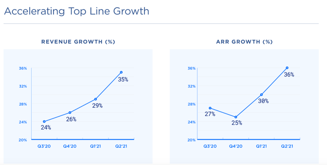 此外,尽管营销非常轻松,但 DigitalOcean 在第二季度增加了 17k 客户,现在拥有 602K,同比增长 9%。请记住,这是非常轻的销售和营销支出。收入增长继续加速,继第一季度的 29% 和第四季度的 26% 之后,第二季度达到 35%。收入增长加速,尤其是公司生命周期的后期(启动后阶段),是衡量业务表现的一个惊人指标。