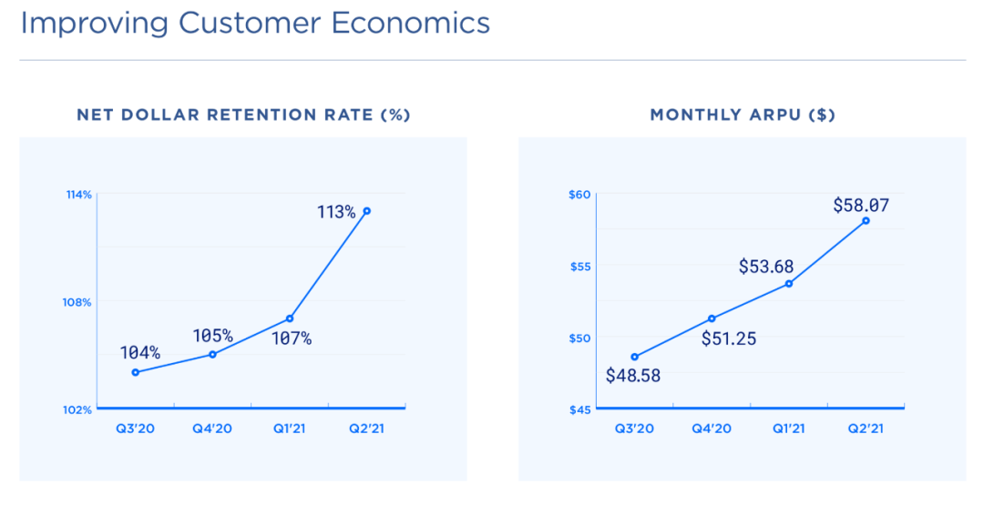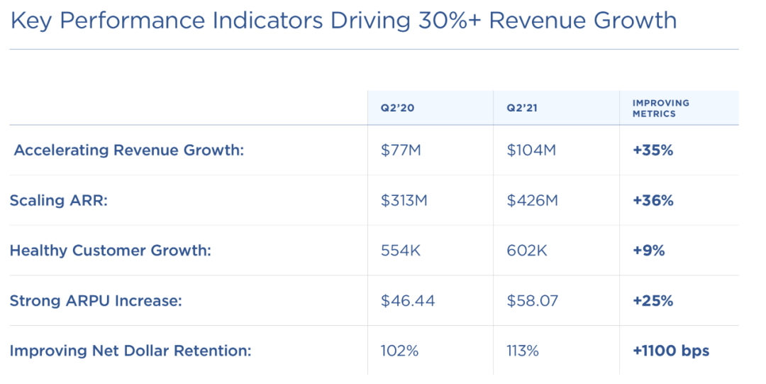 30 年代中期的收入和 ARR 增长,是连续和 y/y 的加速器。随着客户升级支出和流失减少,客户支出同比增长 1,100 个基点。尽管营销力度不大,但客户增长势头强劲。随着企业规模和平台支出规模的扩大,每月 ARPU 继续快速增长。