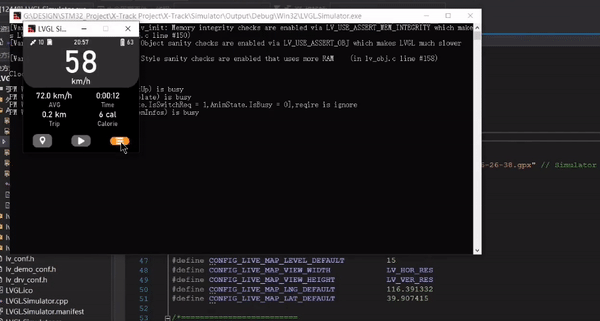 成品使用了许多LVGL提供的基础控件,例如在地图页面的轨迹显示中使用了line控件,地图显示使用了image控件,在表盘页面的页面切换选择,使用了button控件。