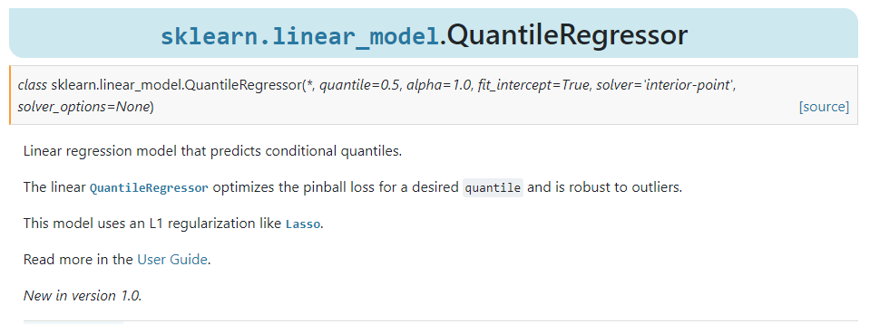 新版本中在sklearn.linear_model下添加了线性分位数回归模型QuantileRegressor(),可用于构建回归模型由自变量求出因变量的条件分位数,近年来在计量经济学中应用广泛。