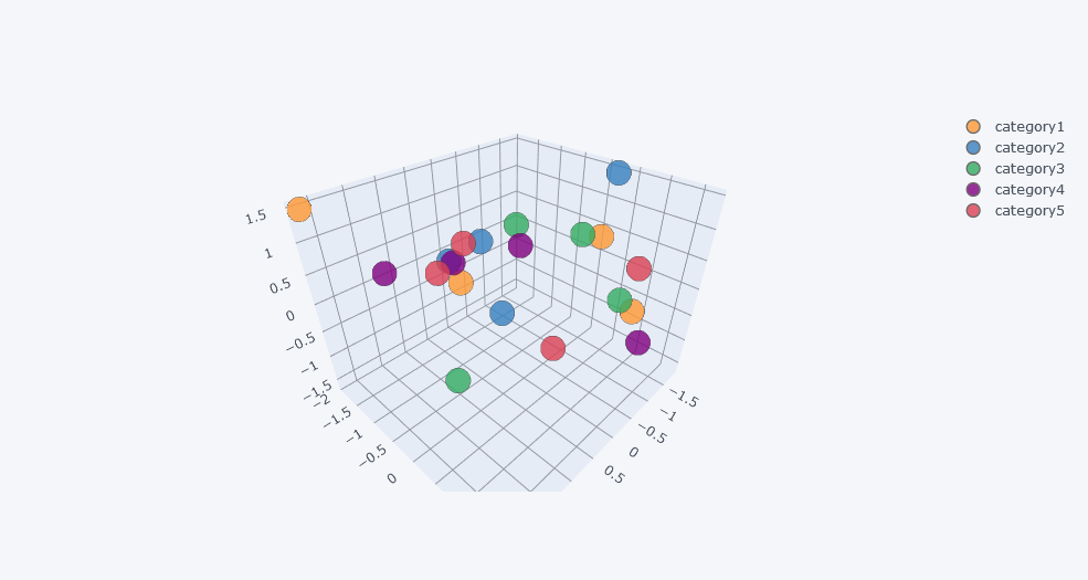 cf.datagen.scatter3d(5,4).iplot(kind='scatter3d',x='x',y='y',z='z',text='text',categories='categories')