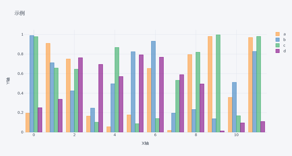 df.iplot(kind ='bar',title='示例', xTitle = 'X轴', yTitle ='Y轴')