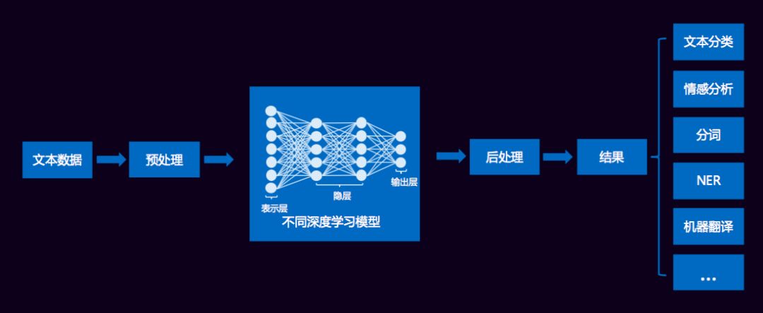 文本数据经过清洗、分词等预处理之后,传统方法通过提取诸如词频、TF-IDF、互信息、信息增益等特征形成高维稀疏的特征集合,而现在则基本对词进行embedding形成低维稠密的词向量,作为深度学习模型的输入,这样的框架可用于文本分类、情感分析、机器翻译等等应用场景,直接端到端的解决问题,也无需大量的特征工程,无监督训练词向量作为输入可带来效果的极大提升。