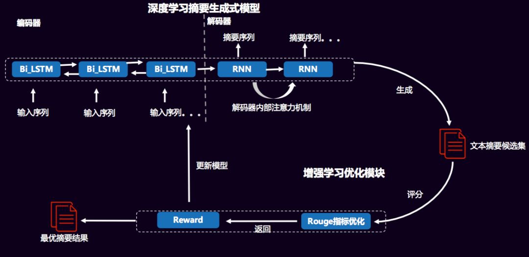 此外,在生成式摘要中,采用强化学习与深度学习相结合的学习方式,通过最优化词的联合概率分布,即MLE(最大似然),有监督进行学习,在这里生成候选的摘要集。模型图如下: