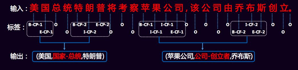 根据标签序列,将同样关系类型的实体合并成一个三元组作为最后的结果,如果一个句子包含一个以上同一类型的关系,那么就采用就近原则来进行配对。