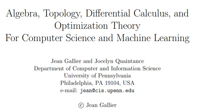 要搞机器学习离不开数学,本文分享一本来自宾夕法尼亚大学计算机系教授Jean Gallier主编的面向机器学习的“数学全书”,内容涵盖线性代数、概率统计、拓扑学、微积分、最优化理论等面向ML的数学知识,共计1900余页,快来下载收藏吧!来与 AI 大咖一起参与讨论吧~