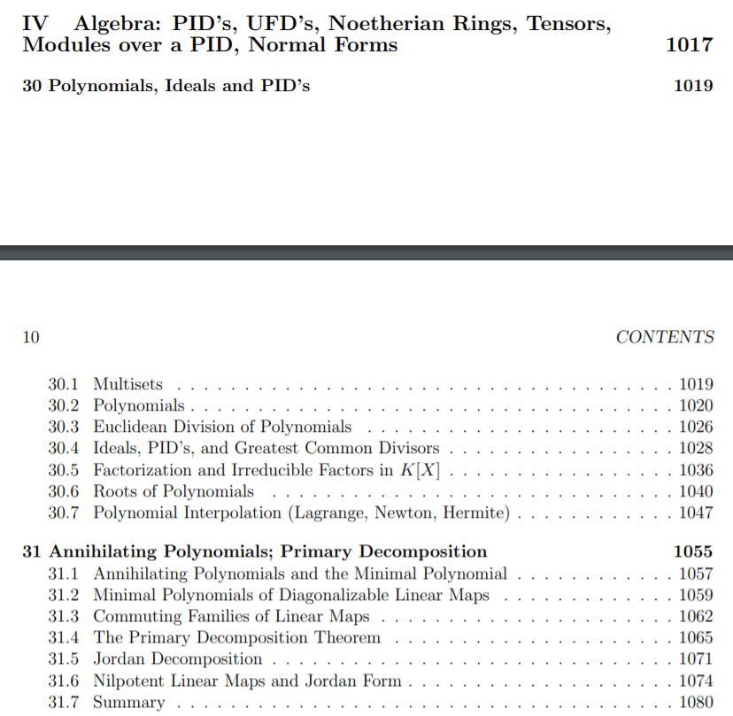 第四部分:Algebra: PID’s, UFD’s, NoetherianRings, Tensors, Modules over a PID, Normal Forms,共7章,约280页