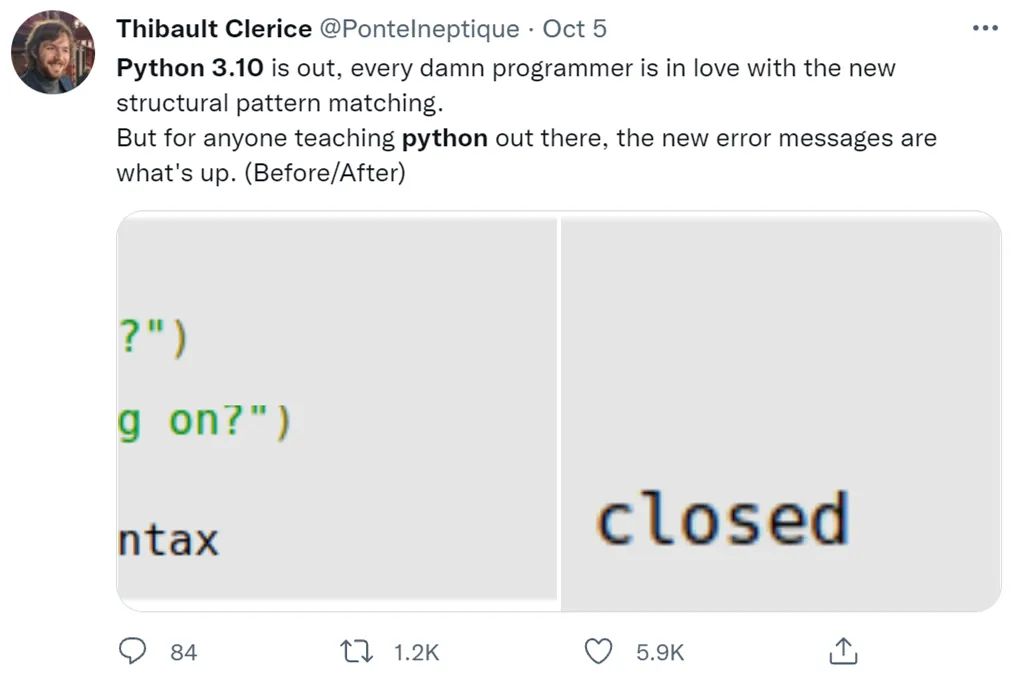 法国学者 Thibault Clerice 表示,「随着 Python 3.10 的发布,每个程序员都会爱上新的『结构模式匹配』功能。」