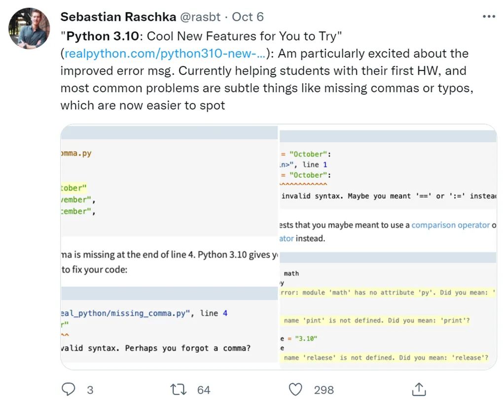 对于 Python 3.10 的新特性,威斯康星大学麦迪逊分校统计学助理教授、畅销书籍《Python Machine Learning》的作者 Sebastian Raschka 表示,「新特性中最令人兴奋的是改进的错误信息提示,像缺少逗号或拼写错误等小的错误,现在很容易被发现。」