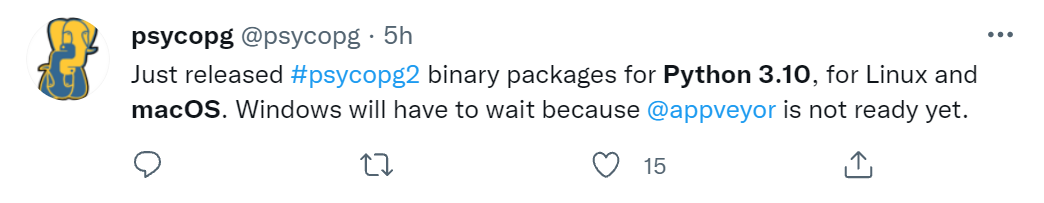 此外,有网友表示,Python 3.10 已经提供了适配 Linux 和 macOS 系统的 psycopg2 二进制包,但 Windows 系统尚未适配好。