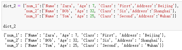 "num_3":{'Name': 'Tom', 'Age': 25, 'Class': 'Second','Address':'Wuhan'}}