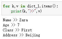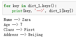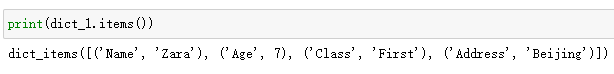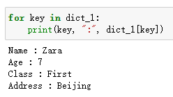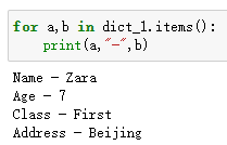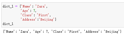 dict_1 = {'Name': 'Zara', 'Age': 7, 'Class': 'First','Address':'Beijing'}