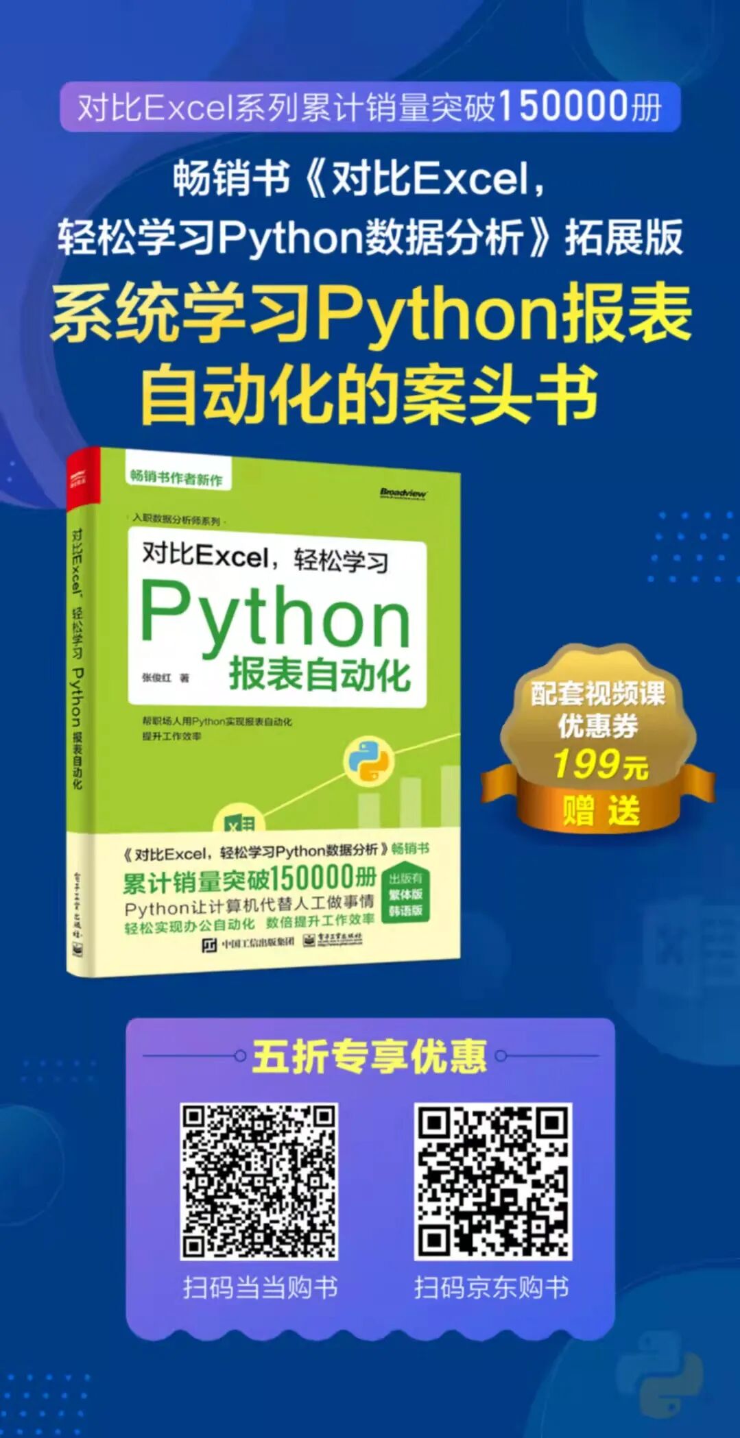 最后还是免费送大家2本《对比Excel,轻松学习Python报表自动化》,只需要在下方进行留言,我会在10月25日10:00 挑选点赞量最高的前2名同学进行送书。